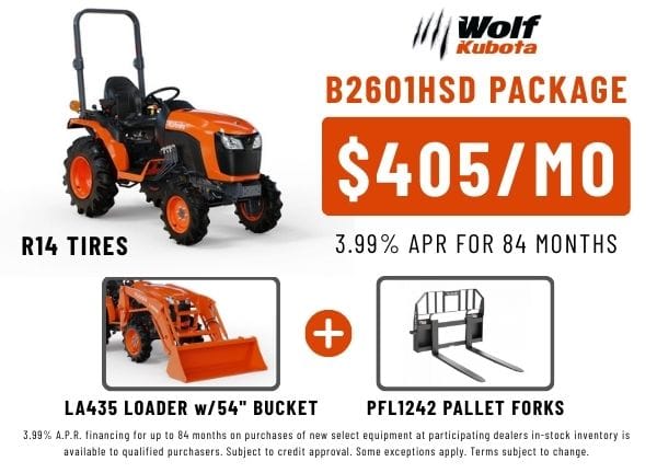 Work smarter and get more done with this Kubota B2601HSD package — equipped with R14 tires, an LA435 loader with 54” bucket, and Land Pride PFL1242 pallet forks. Versatile, durable, and built for all-season performance. Finance for an estimated $405/month for 84 months @ 3.99%.
