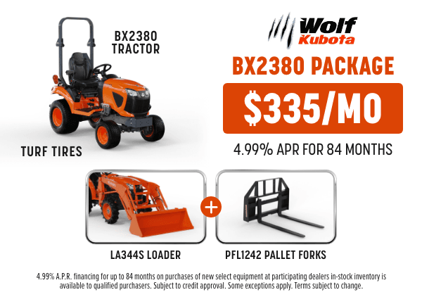 Tackle every job with confidence in this Kubota BX2380 package — featuring turf tires, an LA344S loader, and Land Pride PFL1242 forks. Reliable performance, easy operation, and financing as low as $335/month for 84 months @ 4.99% with KTAC.
