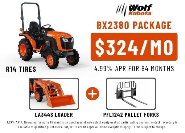Tackle every job with confidence in this Kubota BX2380 package — featuring turf tires, an LA344S loader, and Land Pride PFL1242 forks. Reliable performance, easy operation, and financing as low as $324/month for 84 months @ 4.99%.