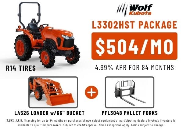 Handle heavy-duty tasks with the Kubota L3302HST package — equipped with R14 tires, an LA526 loader with 66” bucket, and Land Pride PFL3048 pallet forks. Built for strength, versatility, and efficiency. Estimated $504/month for 84 months @ 4.99%.